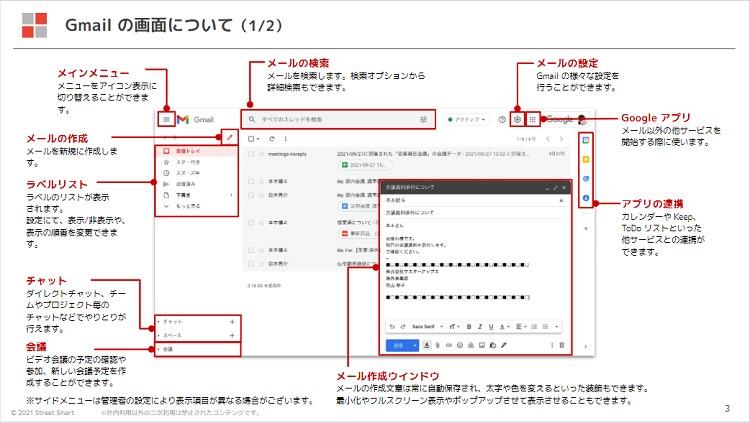 ストリートスマートが制作するマニュアルは、単純な操作説明に留まらないのが特長です。例えば、共有ファイルの検索性を高める「おすすめファイル命名ルール」や、カレンダーを使った効率的な日程調整方法の紹介など、ツールのコンセプトやベストプラクティスを理解していただくことで、より実践的な知識の習得、スムーズな活用に繋がるオリジナルのコンテンツを目指しています。