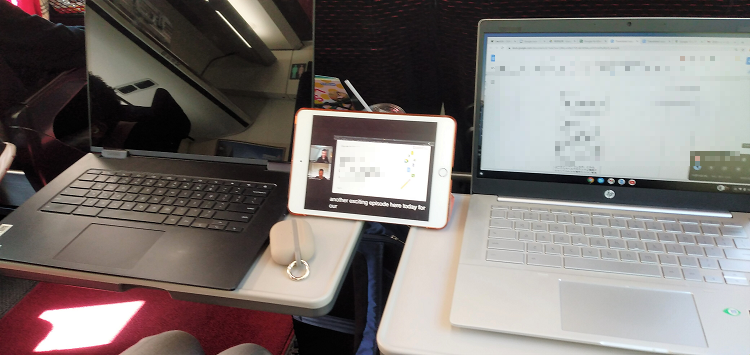 ▲出張中、移動のための飛行機の中で打ち合わせをすることも