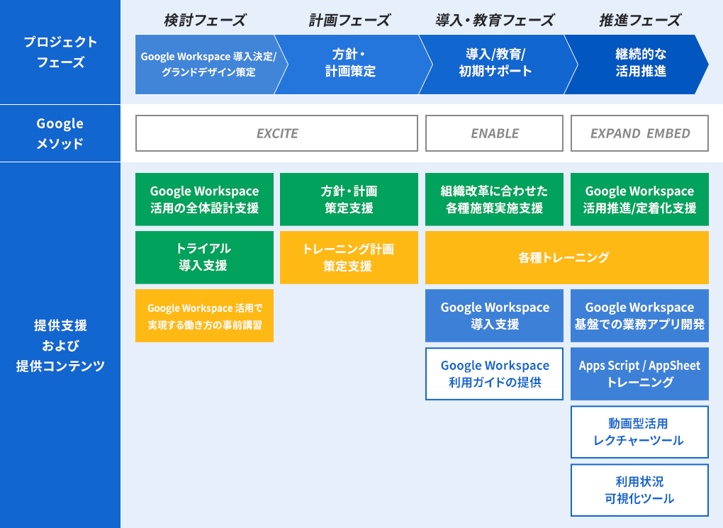 例えば、会議は Google Meet でできるようになるので出張費は必要最低限に抑えられます、とか、会議前に Google ドキュメントでアジェンダを共有することで会議を意思決定の場にしていきましょう、など、GWS を使うことで得られる恩恵、具体的な業務シーンや使い方をご提案し、チーム内の合意を取るところから支援が始まります。
