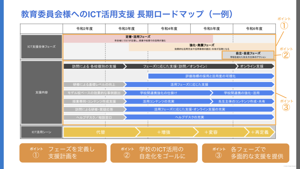 ・長期的に支援させていただく場合、ICT活用のどのフェーズにあるかを定義し支援計画を立てる。