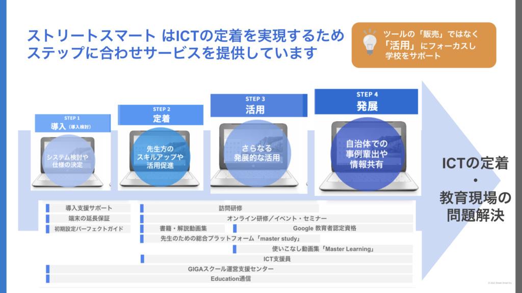 ・そのために、ICTツールの「販売」ではなく「活用」にフォーカスして支援を行なっている。