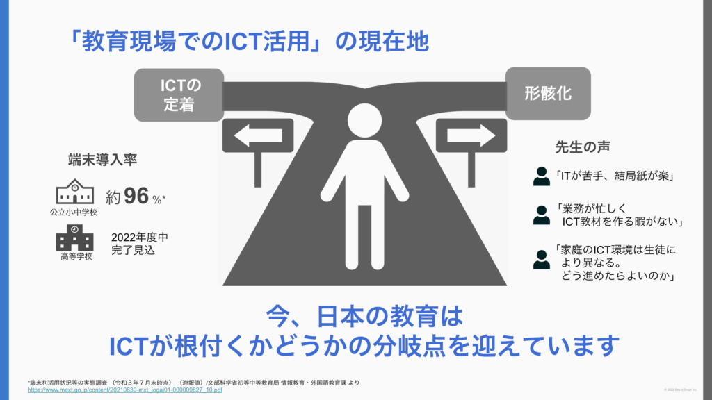 ・文部科学省が掲げる「GIGAスクール構想」により、端末の導入・整備が進んでいる。一方で現場の先生からはICTに対する後ろ向きな声も聞かれる。
